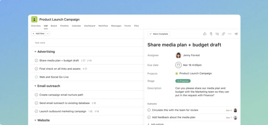 Kolejnym przydatnym programem jest Asana – jest to narzędzie o bardzo intuicyjnym interfejsie, który sprawdzi się zarówno dla osób z doświadczeniem technicznym, jak i tych bez niego.